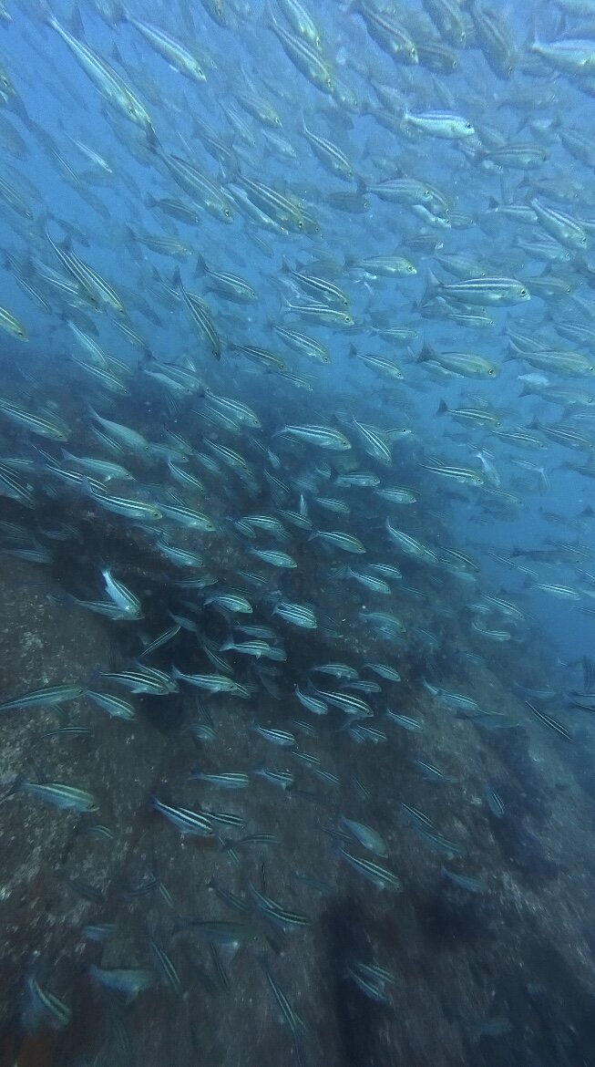 イサキ、タカベ、ウスバハギ、カンパチ、カツオなど、たくさんの魚の群れを見ることができました。