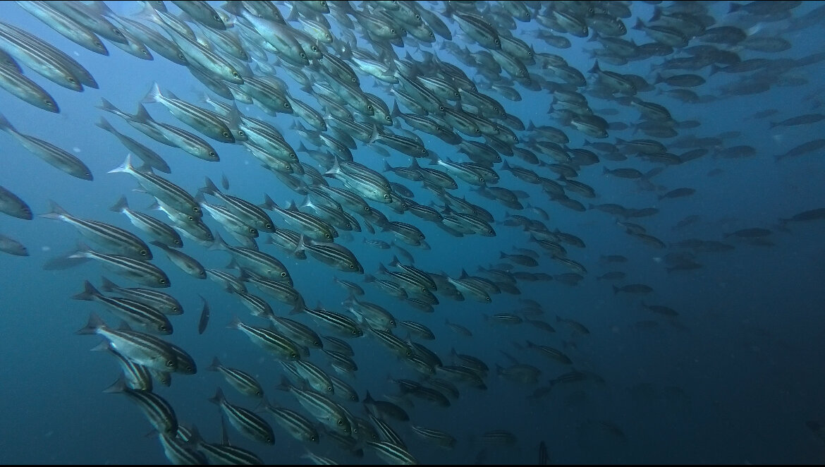 Huge schools of chicken grunt (Isaki), yellow-striped fusilier (Takabe), and mackerel scad (Muroaji),