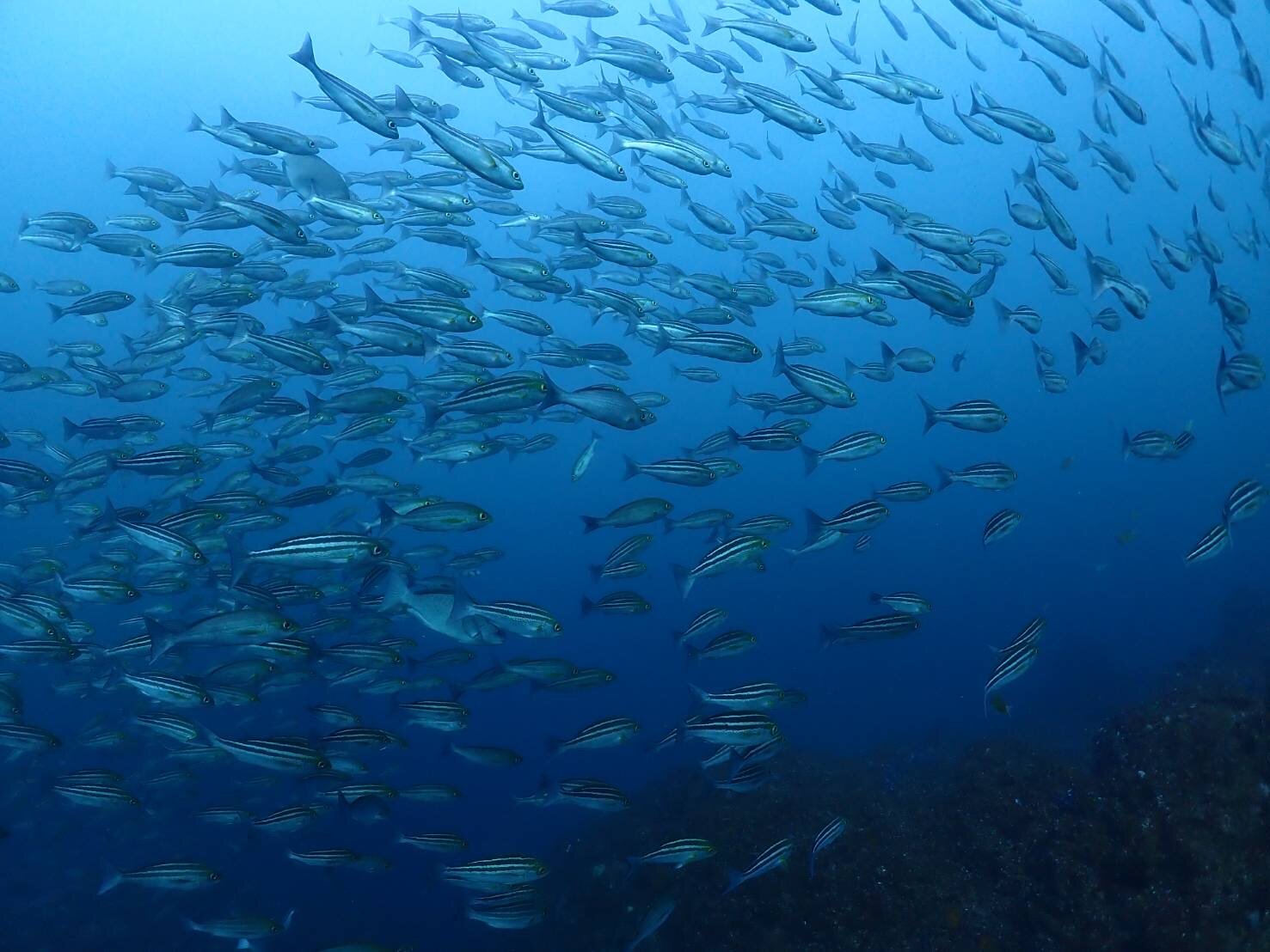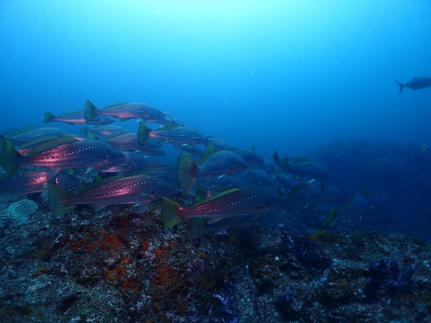We saw schools of grunts (Isaki), yellow-striped fusiliers (Takabe), mackerel scads (Muroaji), and even a big group of giant croakers (Oonibe)!